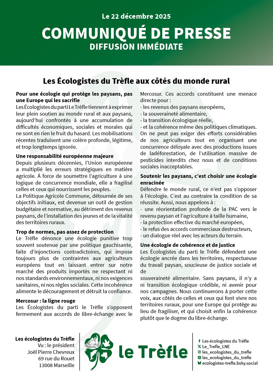 Les Écologistes du parti Le Trèfle tiennent à exprimer leur plein soutien au monde rural et aux paysans, aujourd'hui confrontés à une accumulation de difficultés économiques, sociales et morales qui ne sont en rien le fruit du hasard. Les mobilisations récentes traduisent une colère profonde, légitime, et trop longtemps ignorée.